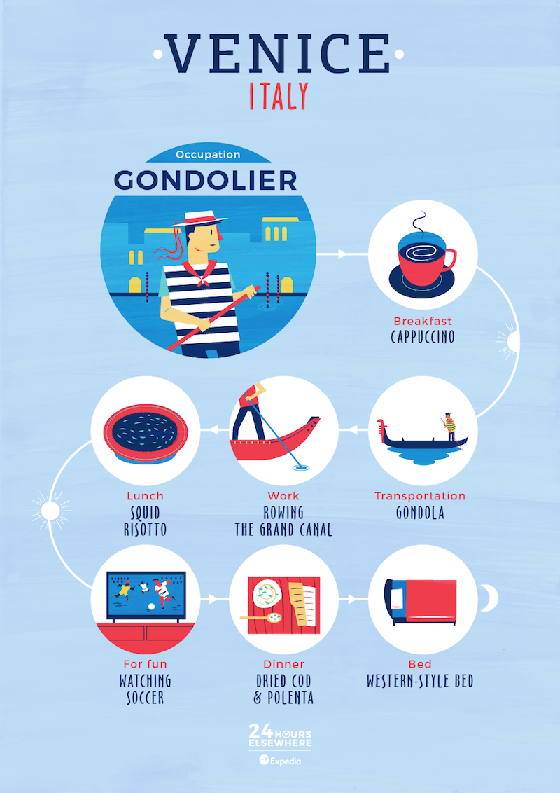 Travelling can open our eyes to the ways of the world, but when stuck on the tourist track it can be hard to get a real idea of what local life is like in foreign lands. Thanks to Expedia you can take a glimpse into what a traditional day looks like in different parts of the world. Compare it to your own or use it as motivation to travel, living as the locals do. They’ve put together a guide of what 24 hours elsewhere looks like for the locals in eleven different parts of the world. They focus on food, travel, work, fun and sleep to give you a glimpse into the most important aspects of local life.